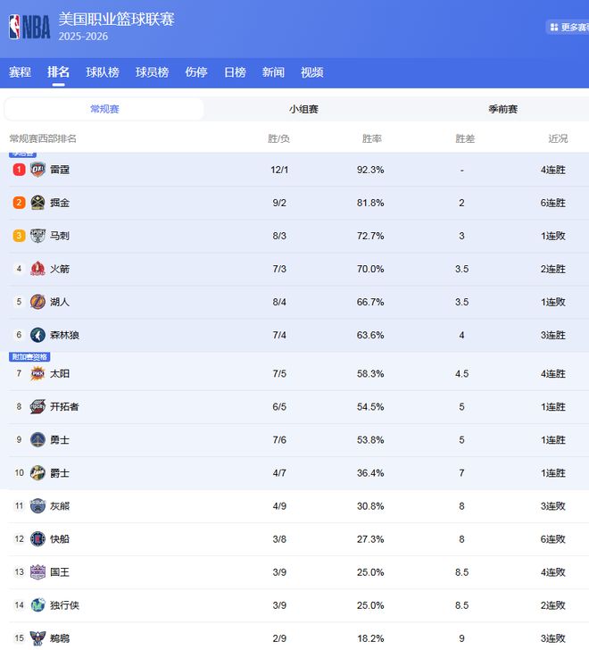 西部最新排名!2黑马崛起,3强队陨落;火箭坐4望3,湖人第5